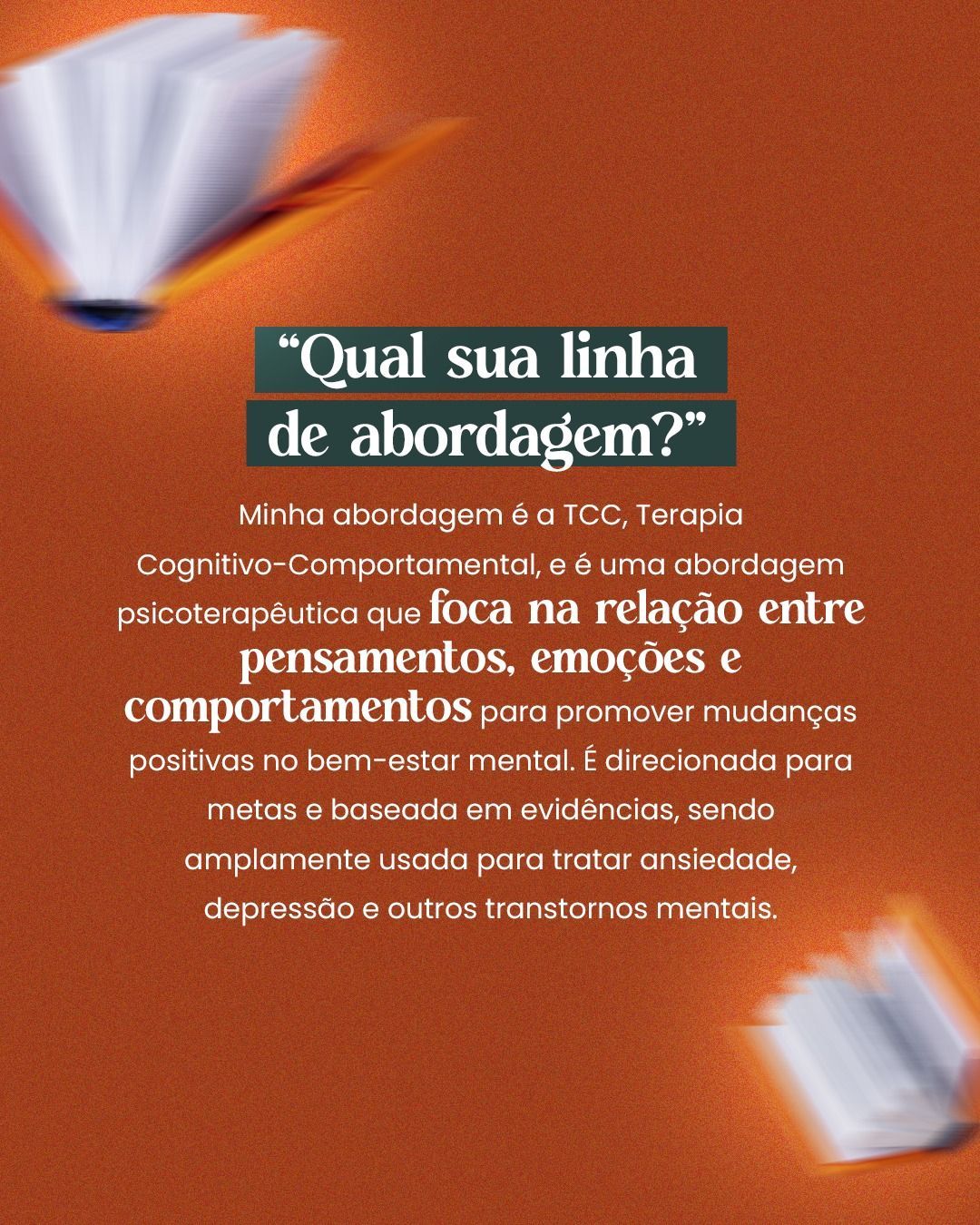 A TCC é uma abordagem científica, prática e eficaz, com resultados comprovados no tratamento de diversos transtornos psicológicos, como ansiedade, depressão e transtorno bipolar. Meu objetivo é ajudar cada paciente a compreender seus pensamentos, emoções e comportamentos, desenvolvendo estratégias que favoreçam equilíbrio e qualidade de vida.